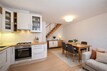 Dispozičně je byt řešen prostorným obývacím pokojem s kuchyňským koutem, přičemž kuchyň je vybavena elektrickou troubou a plynovým sporákem. Součástí bytu je koupelna a samostatné WC. V přízemí se dále nachází ložnice se vstupem na balkon. Do horního patra vede dřevěné schodiště, kde je k dispozici pracovna nebo otevřený kout a samostatná ložnice.