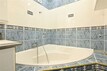 Koupelna s rohovou vanou: Moderně obložená koupelna v modrobílých tónech s prostornou vanou. Přiložená vizualizace ukazuje i potenciál pro případnou úpravu se sprchovým koutem.