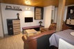 Obývací část pod spacím patrem je už zařízená - sedací souprava, obývací stěna a TV . Z pokoje jdete rovnou na terasu 9 m2 (ta se do plochy nepočítá, ale na kafe je skvělá).